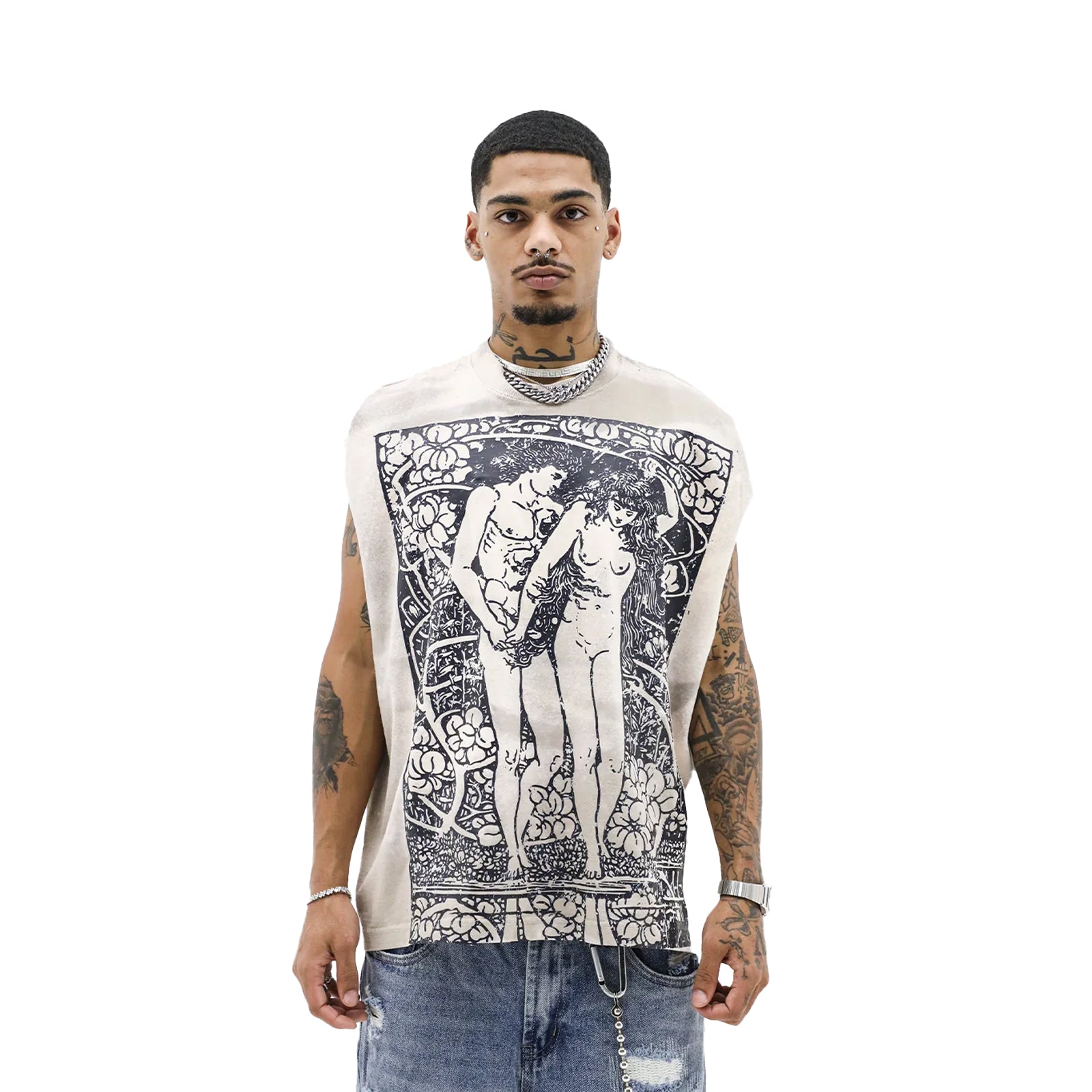 A raw interpretation of beginnings and consequences. We hit our heavyweight drop shoulder tee, garment-dyed to create that aged, lived-in finish. The artwork tells the story of Adam & Eve—bold, symbolic, and unapologetically real.